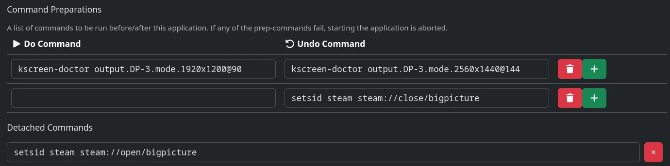 kscreen-doctor output.<port-name>.mode.<current-mode>, replacing<port-name>and<current-mode>from the above Step 5. - (Optional) If you want Steam Big Picture to close when you stop streaming, add a new Undo Command